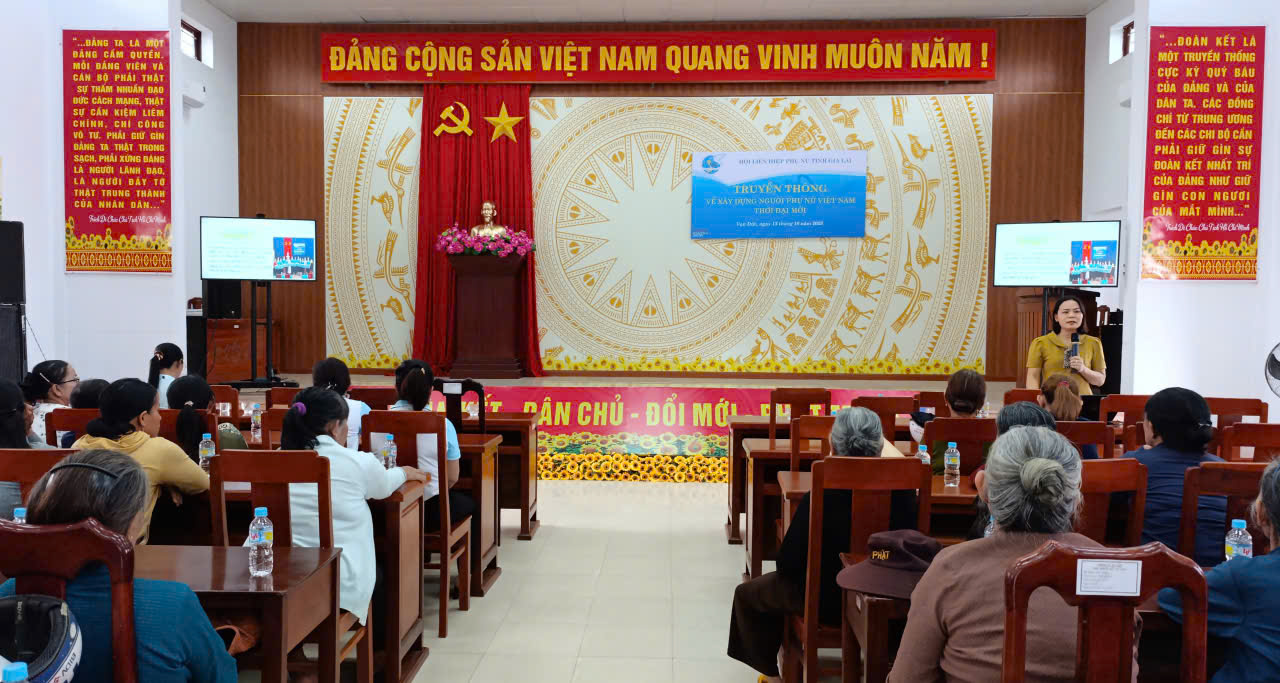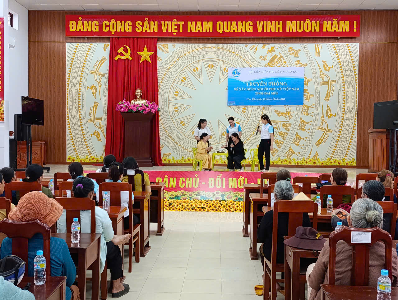 Tại buổi truyền thông các chị em phụ nữ được xem các tiết mục văn nghệ với chủ đề ca ngợi Phụ nữ Việt Nam, xem tiểu phẩm về chủ đề người phụ nữ trong thời đại mới và nghe báo cáo viên Hội LHPN tỉnh Gia Lai báo cáo về kết quả thực hiện phong trào thi đua, nội dung các tiêu chí và giải pháp thực hiện để Xây dựng người phụ nữ Việt Nam thời đại mới tự tin, nhân ái, trung hậu, đảm đang.