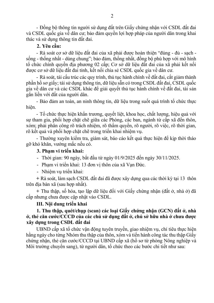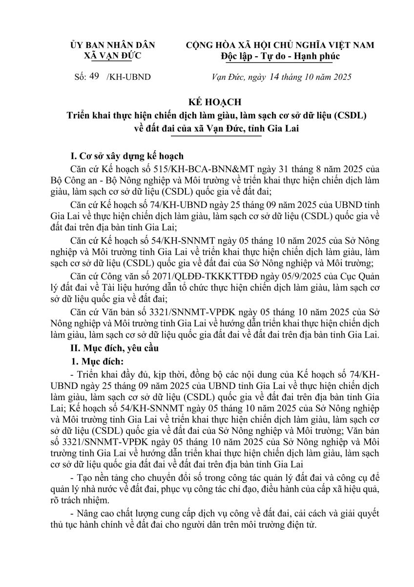 Kế hoạch triển khai thực hiện chiến dịch làm giàu, làm sạch cơ sở dữ liệu (CSDL) về đất đai của xã Vạn Đức, tỉnh Gia Lai.