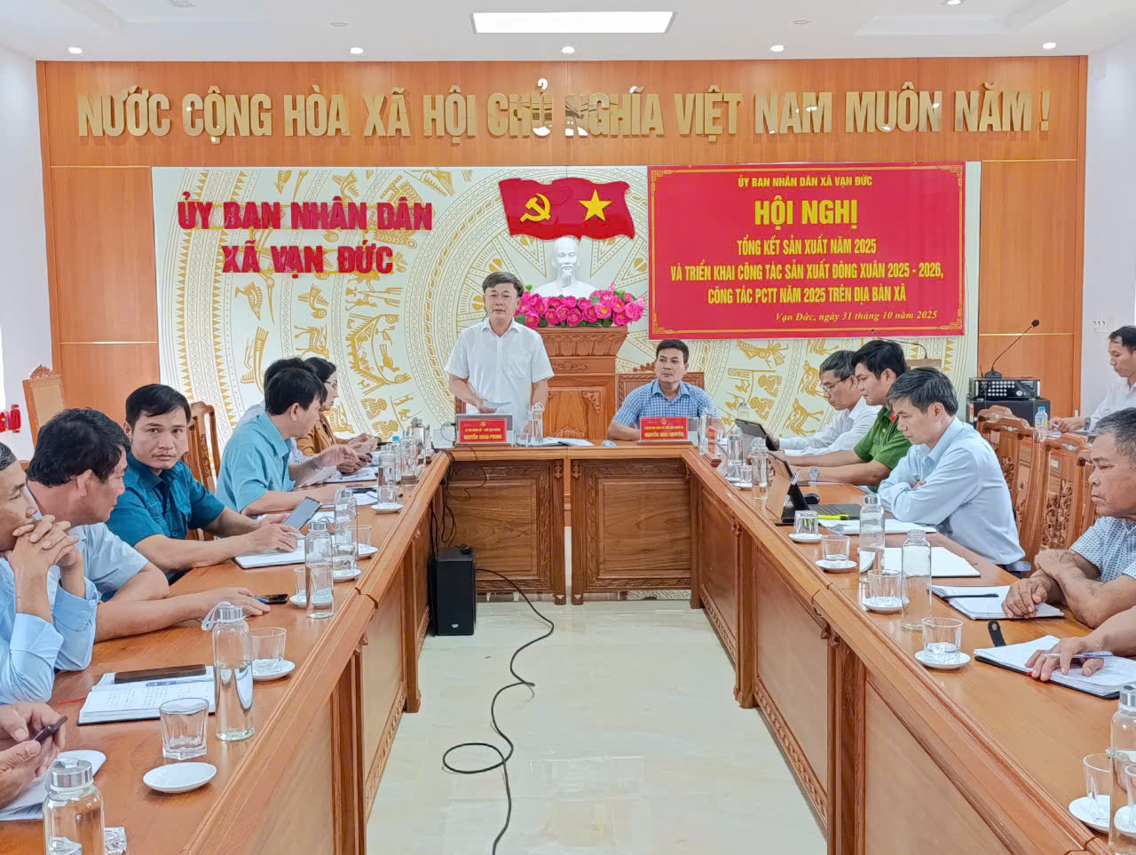 Tiếp thu ý kiến chỉ đạo của đồng chí Nguyễn Xuân Phong. Kết luận hội nghị đồng chí Nguyễn Hoài Nguyên – Chủ tịch UBND xã yêu cầu ngành nông nghiệp của xã cần khắc phục những tồn tại hạn chế trong thời gian qua để triển khai sản xuất vụ Đông xuân đảm bảo theo đúng kế hoạch; các thôn cần tăng cường vận động bà con dọn dẹp đồng ruộng để triển khai sản xuất vụ Đông xuân theo khung lịch thời vụ và cơ cấu giống; tổ chức ra quân diệt chuột đồng loạt trên các thôn để đảm bảo vụ sản xuất đạt kết quả; Tiến hành rà soát tình hình sản xuất các loại cây công nghiệp và cây ăn quả trên địa bàn, đặc biệt đối với các cây công nghiệp có giá cao. Tổ chức triển khai các giải pháp phòng chống dịch bệnh đàn vật nuôi đảm bảo an toàn đồng thời xây dựng kế hoạch tái đàn lợn, phát triển chăn nuôi bền vững trên địa bàn xã gắn với công tác bảo vệ môi trường; chuẩn bị tốt các phương án phòng chống thiên tai đảm bảo theo phương án 4 tại chỗ; Bảo đảm an toàn cho các hồ chứa nước và hỗ trợ kịp thời cho người dân khi bị ảnh hưởng thiên tai.